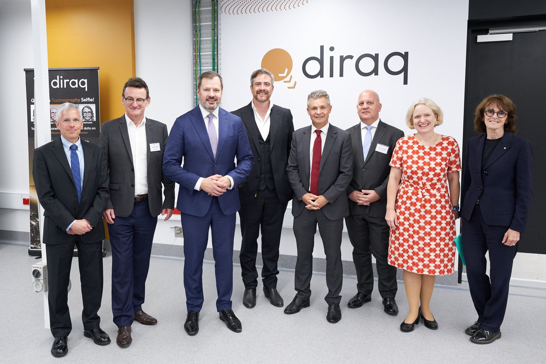 Official guests. From left: The Hon. William (Bill) Jeffrey (Chairman, Diraq), Prof. Andrew Dzurak (CEO & Founder, Diraq), The Hon. Ed Husic MP (Minister for Industry and Science), Prof. Attila Brungs (Vice Chancellor and President, UNSW, Sydney), The Hon. Matt Thistlethwaite MP (Member for Kingsford Smith), Dr. Christophe Jurczak (Partner at Quantonation), The Hon. Professor Verity Firth AM (VP Societal Impact, Equity & Engagement, UNSW) , Dr. Cathy Foley (Australia's Chief Scientist).